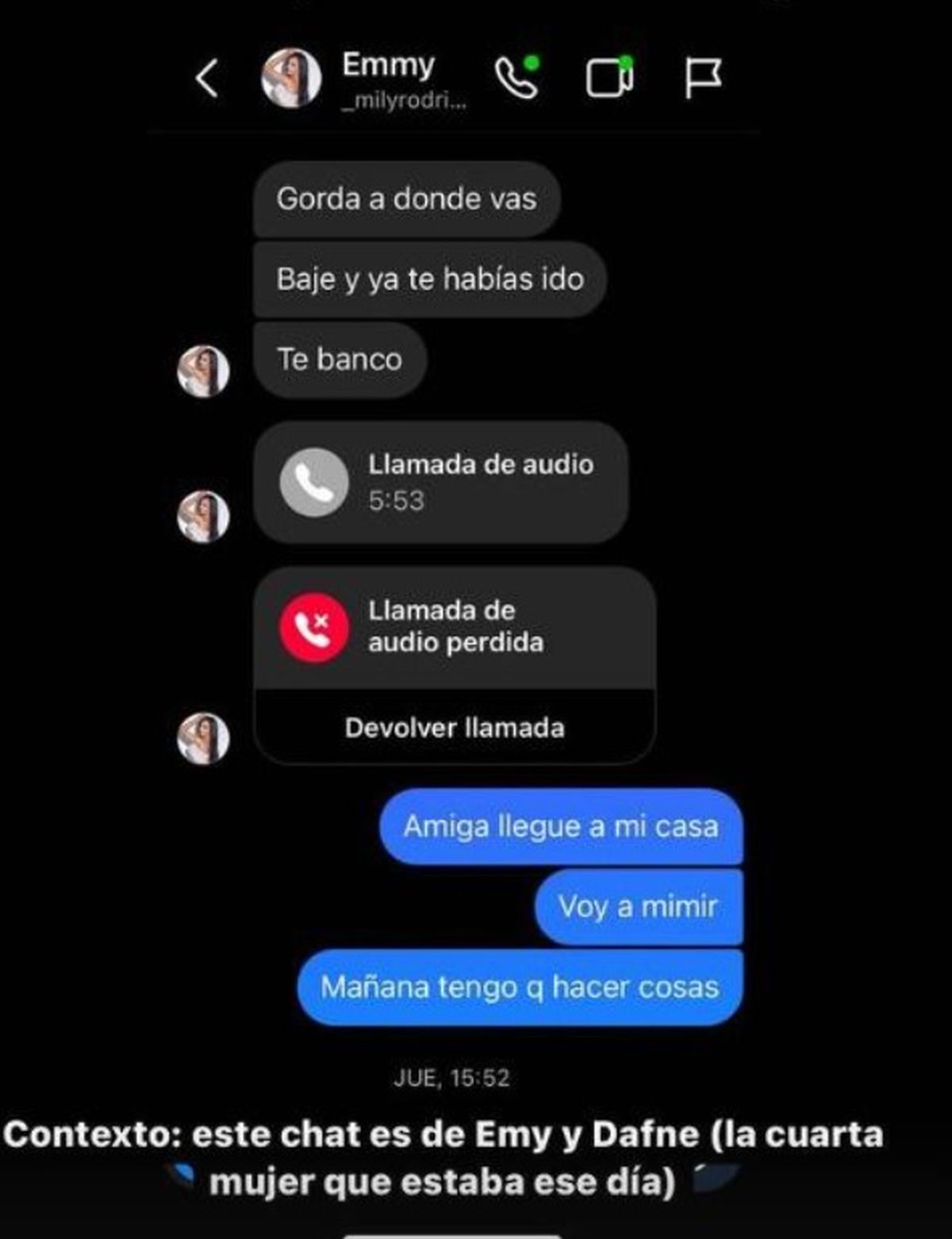 Dafne es la joven a la que, unas tres horas y media antes de caer del sexto piso, la propia Emmily le escribió por Instagram: "Gorda ¿a dónde vas? Bajé y ya te habías ido. Te banco" y le realizó una llamada perdida a las 5.53 de esa madrugada.