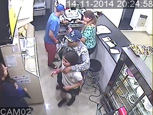 Las cámaras de seguridad de uno de los locales registraron todo el asalto y en las imágenes se puede ver cuando uno de los ladrones utiliza a la pequeña como una especie de rehén para intimidar a los mayores de edad que estaban en el lugar.