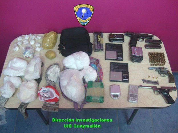 Al entrar al lugar encontraron un revólver calibre 22, una pistola calibre 22, otra pistola 9 mm., 68 cartuchos 9 mm., 23 envoltorios de cocaína con un peso de 10 kilos y medio, cuatro balanzas digitales y químicos.En el lugar capturaron a una mujer de 21 años, otra de 39 años y un hombre de 34 años quienes quedaron a disposición de la Justicia Federal por las drogas y de la Oficina Fiscal Nº 9.