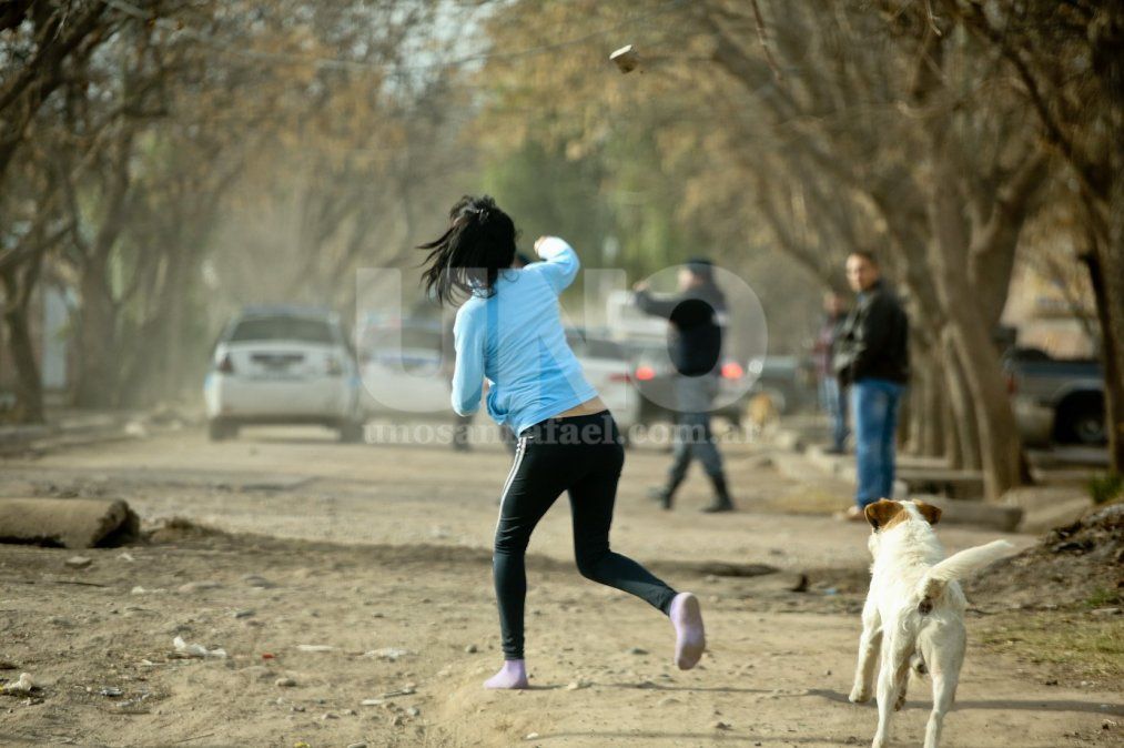 La detención de este hombre y el ingreso a las viviendas de los policías enardeció aún más a los vecinos que en plena calle se enfrentaron con los efectivos en una verdadera batalla campal, especialmente mujeres que arrojaron piedras. También cayeron algunas de gran tamaño desde los patios de casas de ambas calles. Los efectivos respondieron con balas de goma para disuadir a los revoltosos.