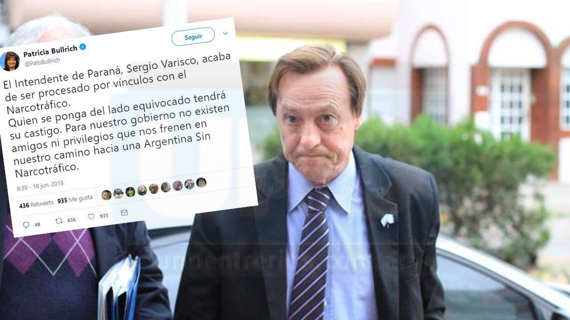 El tuit de Bullrich fue inmediatamente después de conocerse el procesamiento de Varisco en la causa, por la cual deberá pagar también una caución real. "Para nuestro gobierno no existen amigos ni privilegios que nos frenen en nuestro camino hacia una Argentina Sin Narcotráfico", sostuvo.