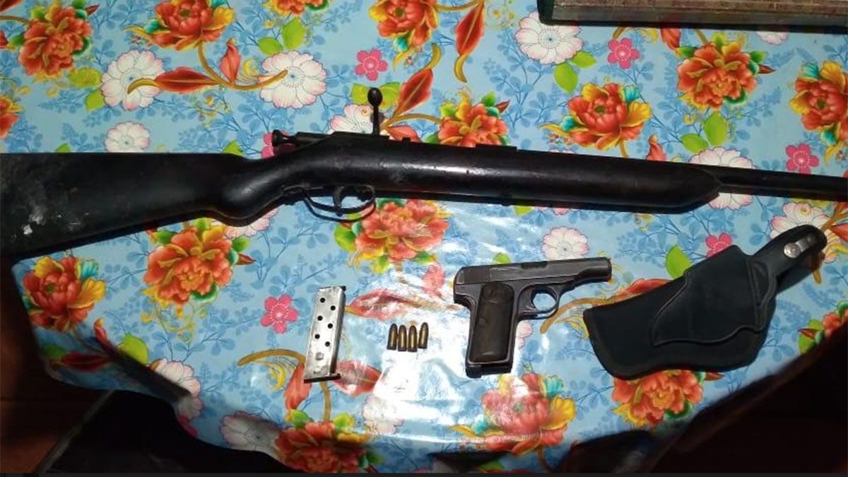 En estos allanamientos encontraron dos pistolas calibre 22, una de ellas cargada con ocho municiones del mismo calibre, además, un revólver calibre 22 largo cargado con seis proyectiles y un cartucho calibre 16.
