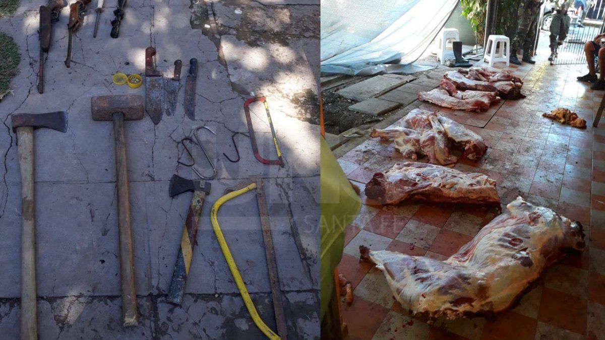 ambién fueron secuestrados los elementos logísticos usados por la banda de criminales tales como vehículos, hachas, martillos, sierras de corte, ganchos metálicos, freezer en pésimas condiciones de higiene, armas de fuego, balas, motocicleta, cuchillos, chairas, machetes, restos óseos de vacunos, alicates de corte de uso industrial, balanzas, cierra eléctrica de uso en carnicería para el trozado de los cuartos.