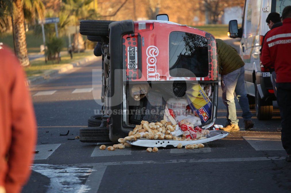 Por el impacto la Partner terminó volcando y los policías que llegaron hasta el lugar debieron romper una ventanilla para sacar al acompañante de la Partner.