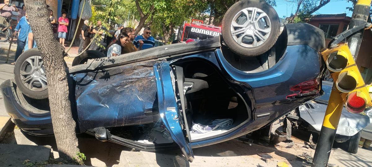 Un fuerte choque se registró este sábado en la intersección de calles Ayacucho y Montecaseros, en la Ciudad de Mendoza, donde dos vehículos colisionaron y uno de ellos terminó volcado tras impactar contra un semáforo.