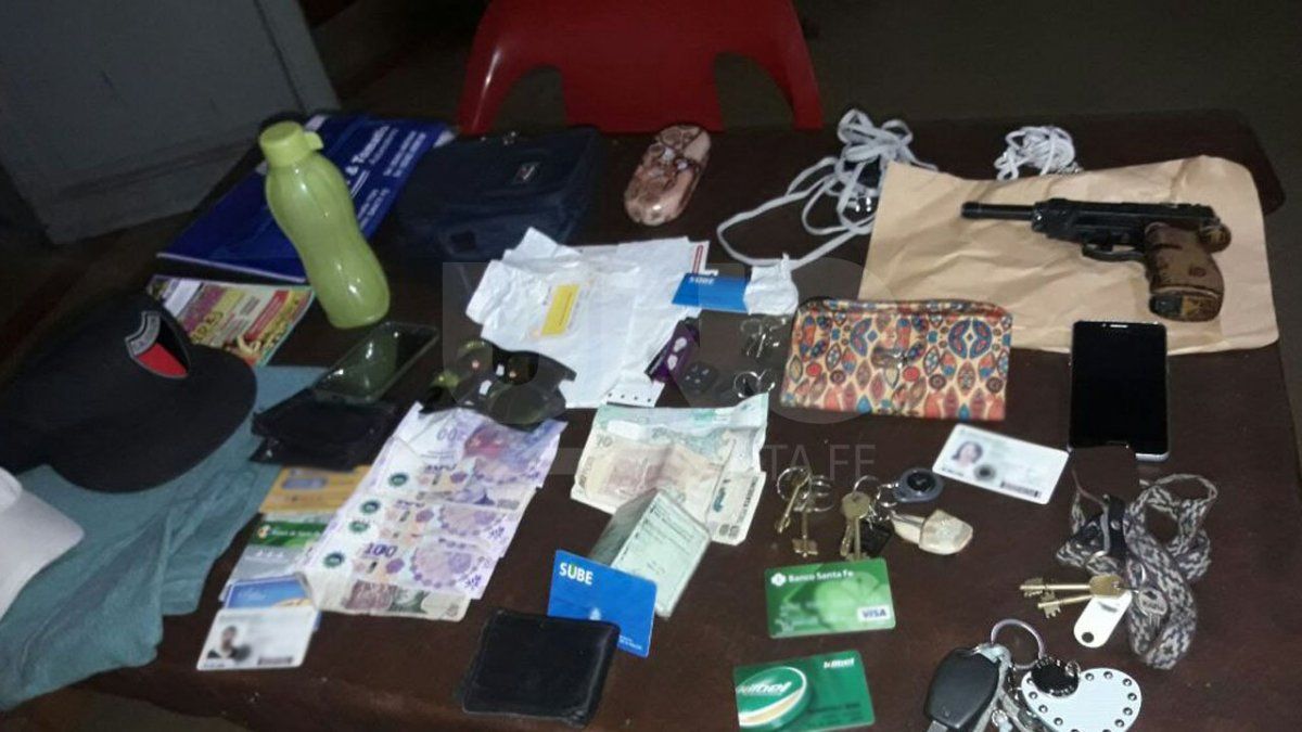 Del interior del auto secuestraron una réplica de arma de fuego, y un bolso con dinero y documentación a nombre de una mujer que había sido asaltada en la vía pública a punta de pistola, por un trío de sujetos.