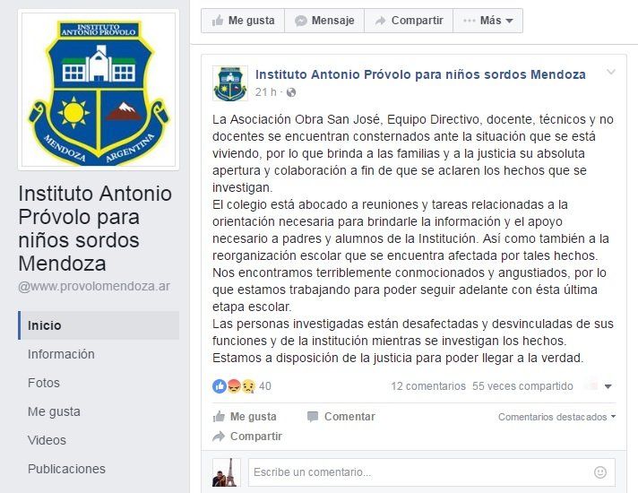 En la página de Facebook del establecimiento religioso se publicó un escrito apoyando la investigación: