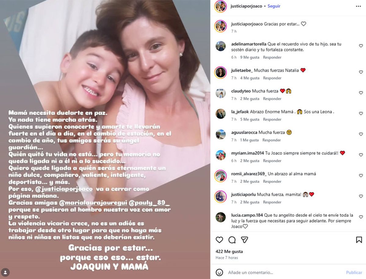 Por tanto, consideró: “Quien quitó tu vida no está, pero tu memoria no queda ligada ni a él ni a lo sucedido. Quiero que quede asociada a quién serás eternamente: un niño dulce, compañero, valiente, inteligente, deportista y más. Por eso, ‘Justicia por Joaco’ va a cerrar como página mañana”.