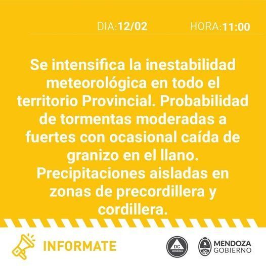 A las 11 Defensa Civil publicó un alerta por las redes sociales, la cual indica: "Se intensifica la inestabilidad meteorológica en todo el territorio provincial. Probabilidad de tormentas moderadas a fuertes con ocasional caída de granizo en el llano. Precipitaciones aisladas en zonas de precordillera y cordillera".