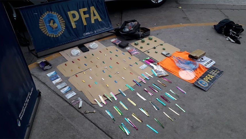 Allí requisaron su mochila y constataron que llevaba medio ladrillo de marihuana, 11 envoltorios de marihuana que pesaron casi 100 gramos, otros 44 envoltorios con cocaína y dos bolsas con piedras de cocaína de máxima pureza con un peso de 150 gramos. También tenía elementos de fraccionamiento como bolsas de papel glasé para armar ravioles de cocaína, tarjetas con restos de esa misma droga, además de una balanza y un celular.