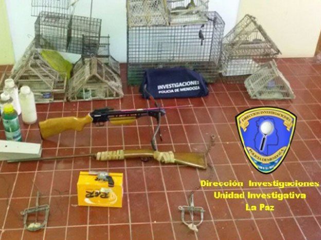 El allanamiento fue en la mañana de este miércoles en una casa de calle 9 de Julio, de La Paz, donde secuestraron un revólver calibre 32, una escopeta calibre 36, una ballesta, 12 trampas para aves, dos trampas para zorros o gatos montés, 10 botellas de un litro con veneno y 18 aves exóticas protegidas.