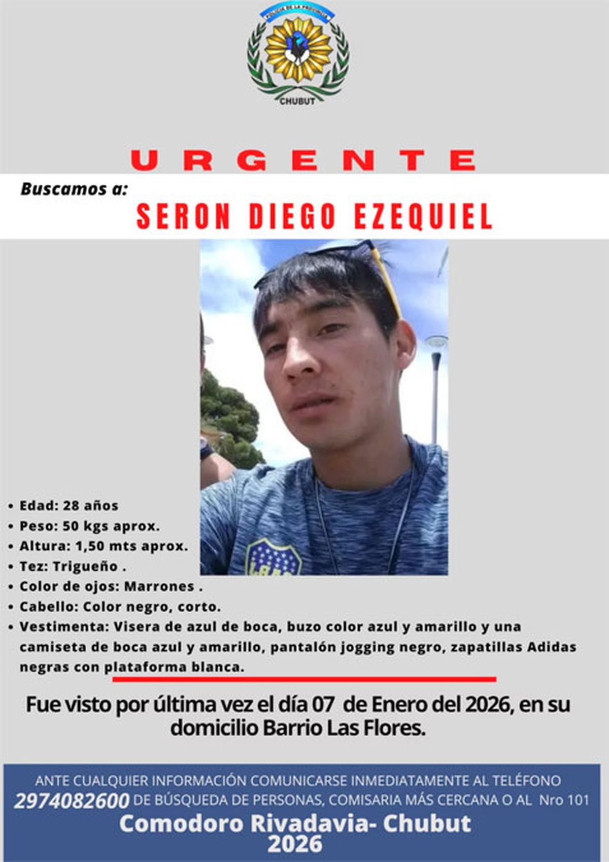Es realmente muy preocupante y angustiante lo que viven todos los familiares y allegados de Diego Serón, el joven de 28 años que está desaparecido en la ciudad de Comodoro Rivadavia, Chubut. El muchacho fue visto por última vez el miércoles 7 de enero, momentos después de que salió de su casa en el barrio Las Flores con el propósito de conseguir un trabajo.
