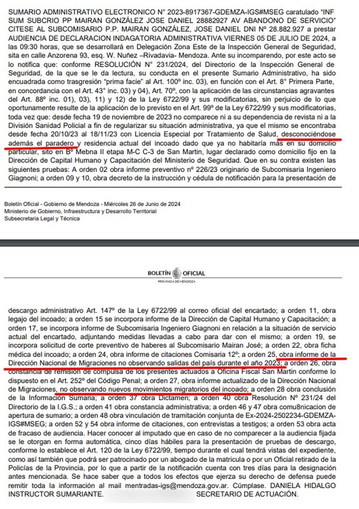 Sin embargo, los edictos publicados por la IGS en el Boletín Oficial subrayan que Migraciones comunicó en dos oportunidades que Mairan no registra salidas del país: