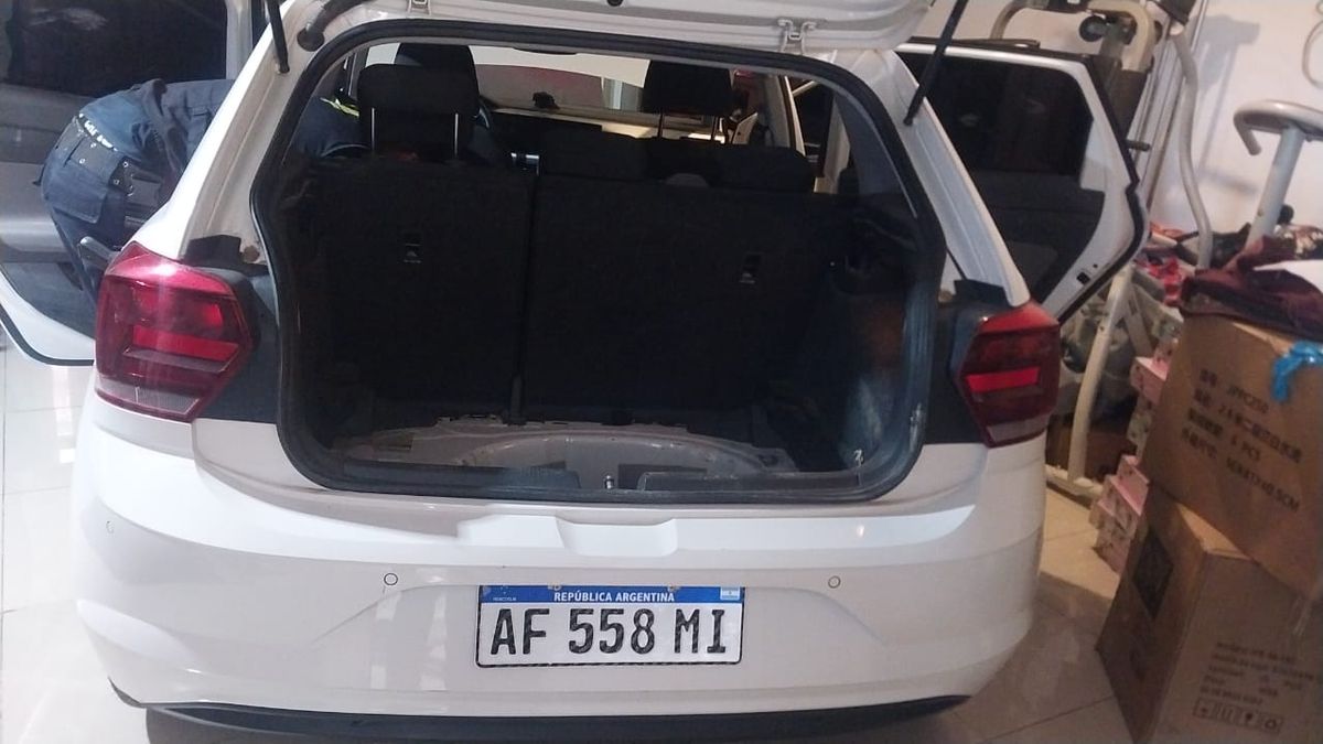 Entre los objetos secuestrados también se halló un automóvil Volkswagen Polo de color blanco, cuya patente (AG 558 MI) no coincidía con el dominio real (AD 877 KB) grabado en los cristales, lo que sugiere una posible adulteración.