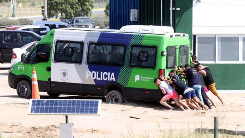 "¡Vamos Los Pumas!", gritan los pibes después de empujar el minibús de traslado de efectivos que los interceptó camino a la playa, los trajo hasta la sede de la Secretaría de Seguridad municipal y se quedó encajado en la arena. El humor sobrevive a pesar de la muy calurosa y soleada tarde que iban a pasar en el mar y los tiene, sin más remedio, bajo el caluroso techo del edificio elegido para las rondas de reconocimiento de imputados por el crimen de Fernando Báez Sosa, ocurrido el sábado último en la ciudad de Villa Gesell.