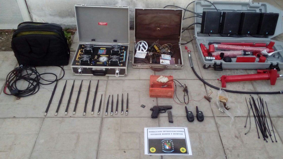 Entre los elementos más llamativos que hallaron en la casa se encuentran inhibidores de señal para teléfonos celulares, que consiste en una especie de maletín con antenas para bloquear el funcionamiento de dichos aparatos en el lugar que se active. Además había equipos de comunicación HT, una pistola calibre 380, expansores (herramientas que podrían servir para romper aberturas), elementos de corte, soldadoras y documentación de todo tipo que tendría información importante. También encontraron un envoltorio con una escasa cantidad de marihuana.