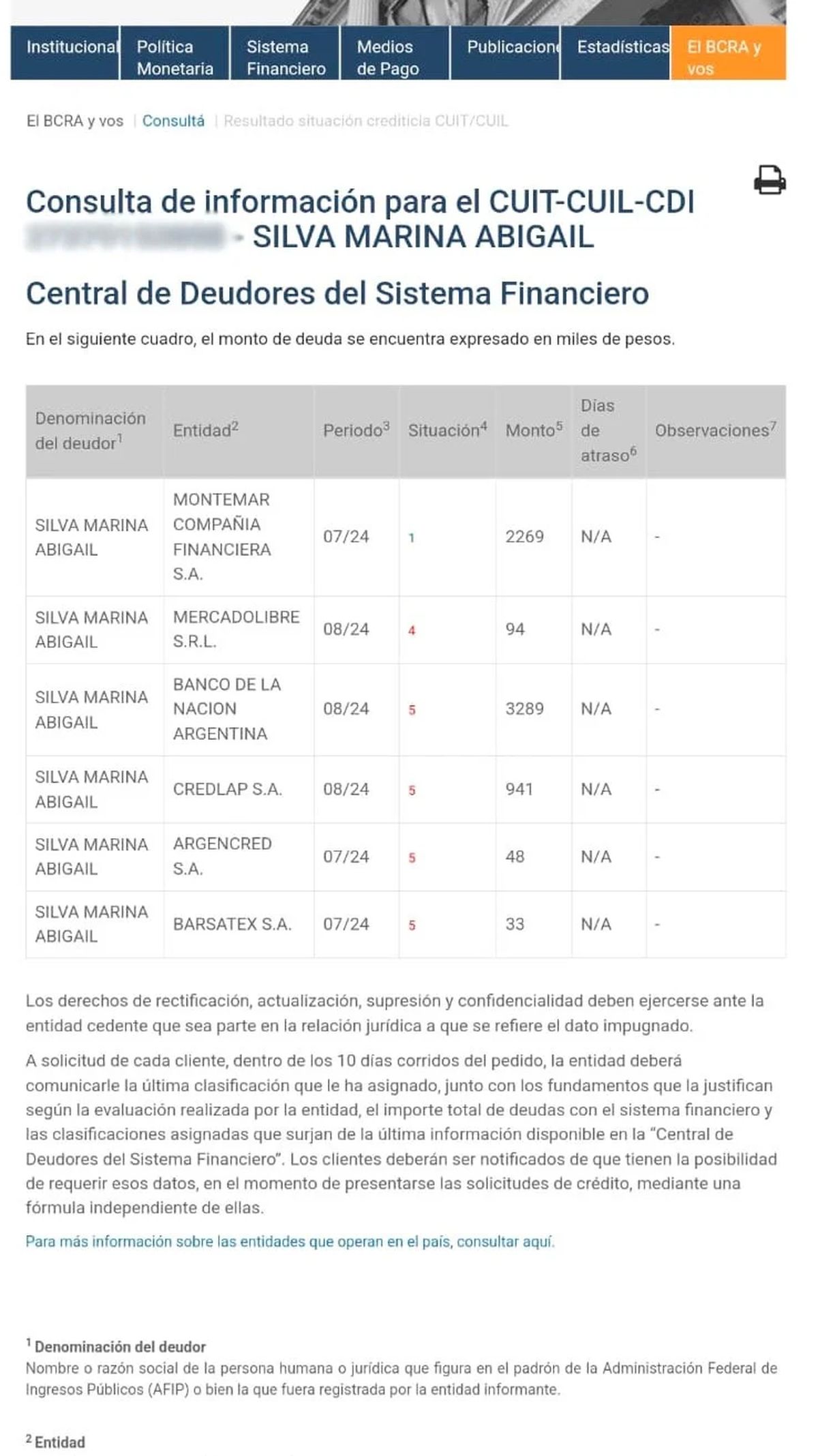 También aparecen deudas mentores de $941 mil a Credlap, $94 mil a Mercado Pago, $48 mil a Argencred y $33 mil a Bersatex.
