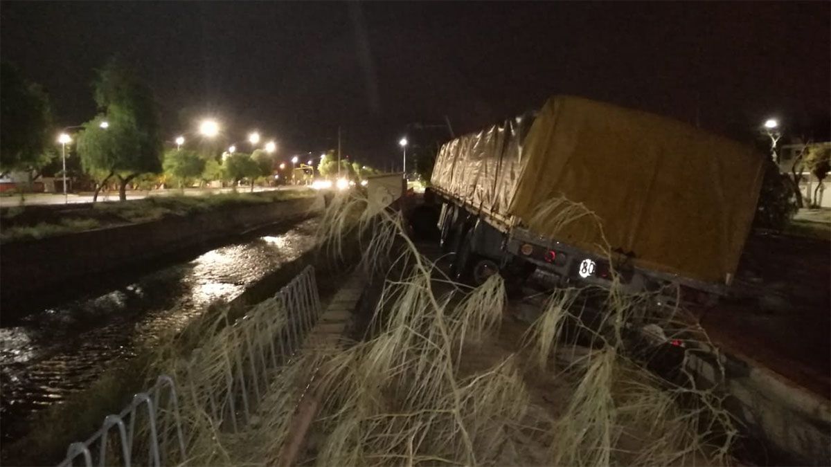 La imagen es impactante debido a que todo el acoplado quedó sobre la vereda de la Costanera, casi pegado a la barrera de contención del canal Cacique Guaymallén.