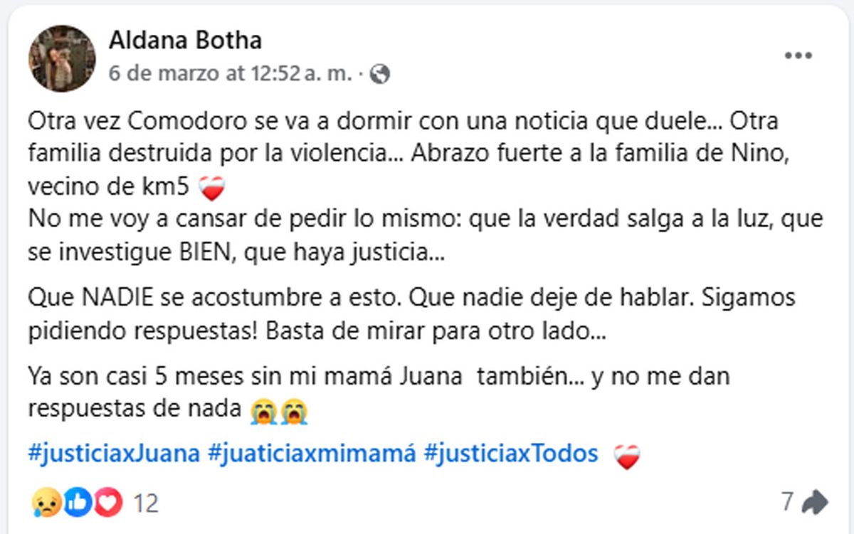 Aldana Botha, hija de Juana Morales, volcó su impotencia en las redes sociales tras conocerse un nuevo hecho de violencia que sacudió a Comodoro Rivadavia.