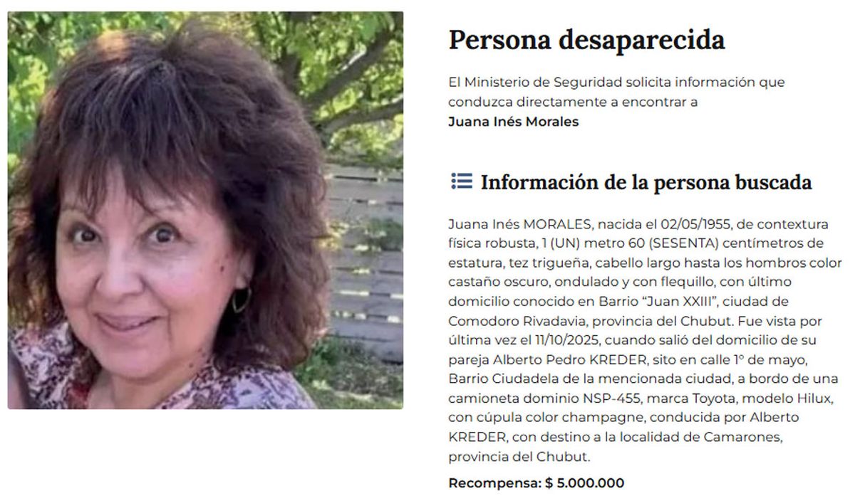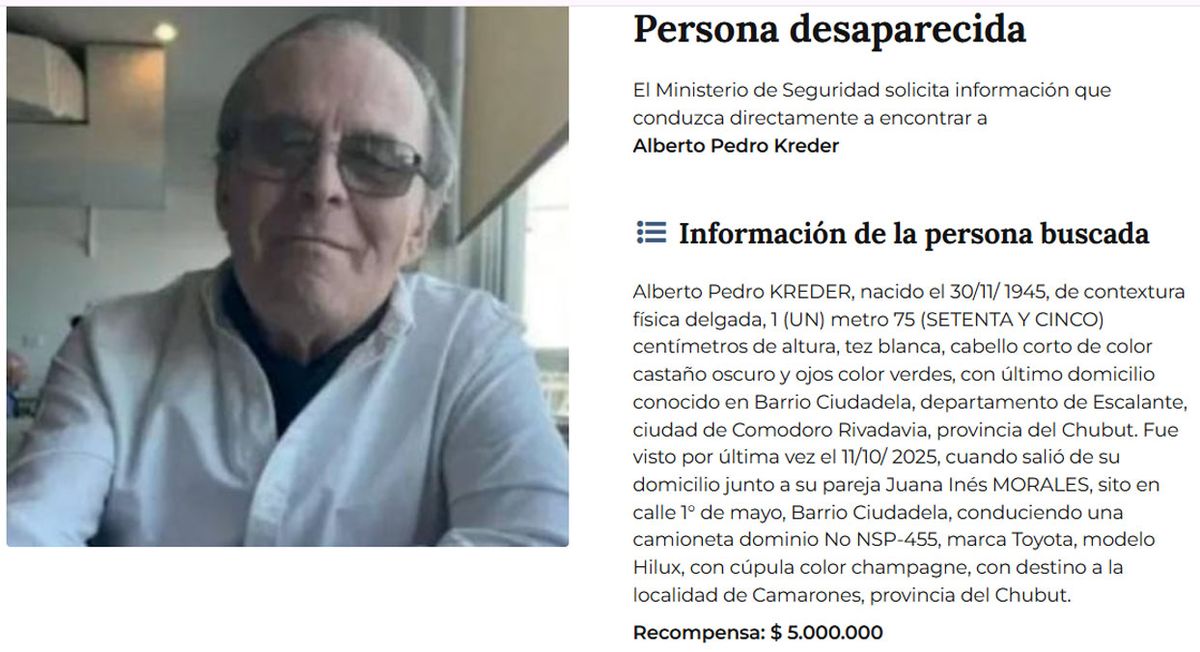 El Misterio de Seguridad que rodea las ausencias de los jubilados desaparecidos Pedro Kreder (79) y Juana Morales (69) en Chubut, ha entrado en una etapa crítica. Cerca de cumplirse cinco meses de aquel 11 de octubre de 2025, cuando salieron de Comodoro Rivadavia con destino a Camarones, el Gobierno ofrece una jugosa recompensa para quien pueda aportar datos certeros.