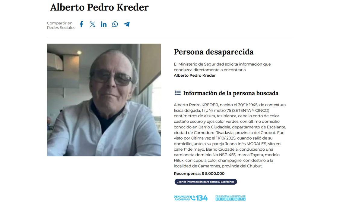 El 11 de octubre de 2025 quedó marcado como el inicio de uno de los misterios más desconcertantes del sur argentino. Pedro Kreder y Juana Morales, pareja de jubilados desaparecidos, salieron con destino a Camarones un pintoresco pueblo costero situado en la provincia del Chubut, pero nunca llegaron.