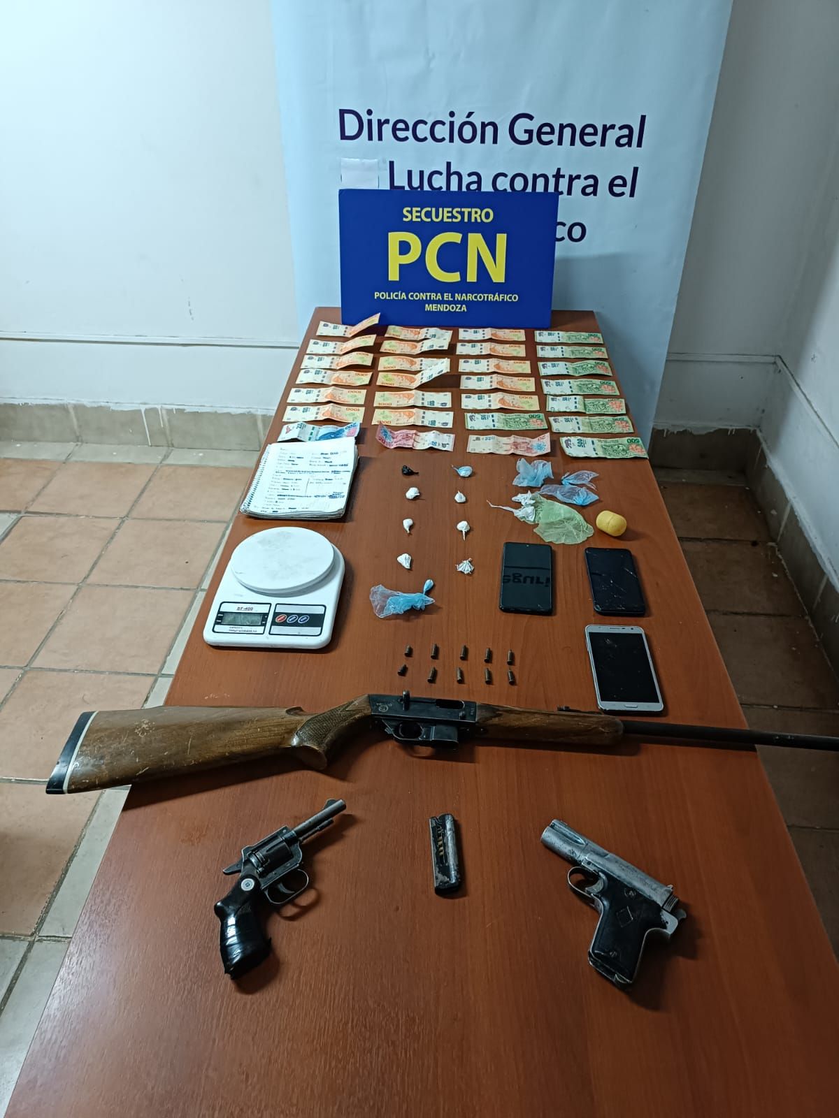 El primer procedimiento se realizó en una vivienda ubicada en Montecaseros y Chivilcoy, de San Martín, en el cual una pareja quedó detenida y se logró el secuestro de 7 envoltorios con cocaína (5,1 gramos), semillas de cannabis (3,2 gramos), tres celulares, $21.240, una balanza digital, recortes de nylon, un cuaderno de anotaciones de interés, una carabina Marca Venado calibre 22, una pistola Marca G.M.C. calibre 22 y un revólver marca TALA calibre 22 largo.