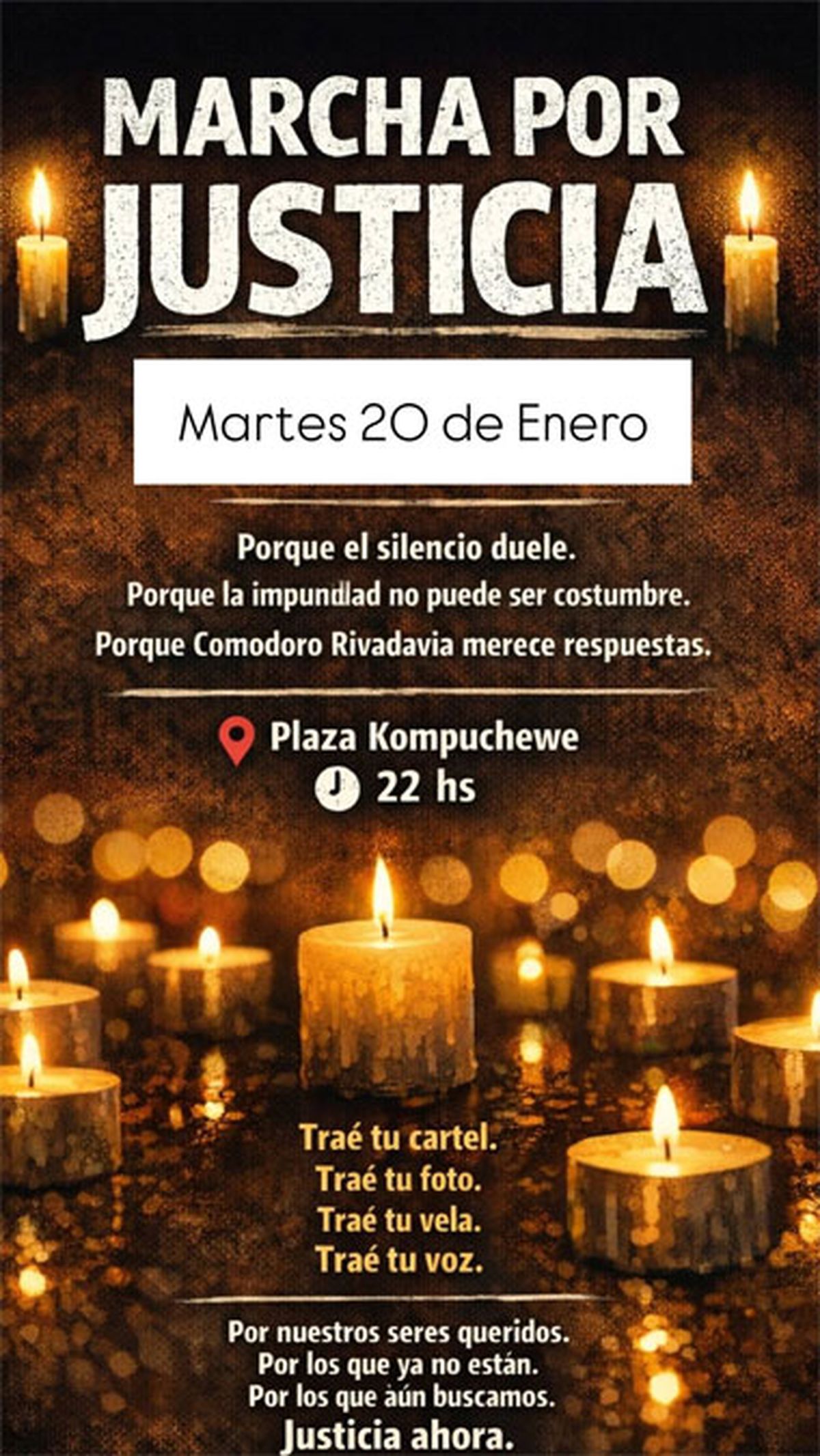 En este sentido, se llama a toda la comunidad para que asista con un cartel, una foto o una vela “porque hoy es por ellos… mañana puede ser cualquiera”.