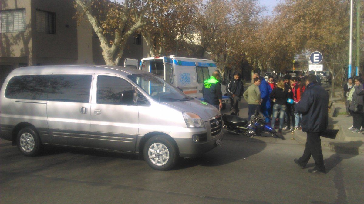 El siniestro vial se produjo en la mañana de este miércoles en dicha intersección por razones que se investigan. Como consecuencia del impacto una mujer y su hijo debieron ser atendidos por los golpes que les provocó el choque y la caída.