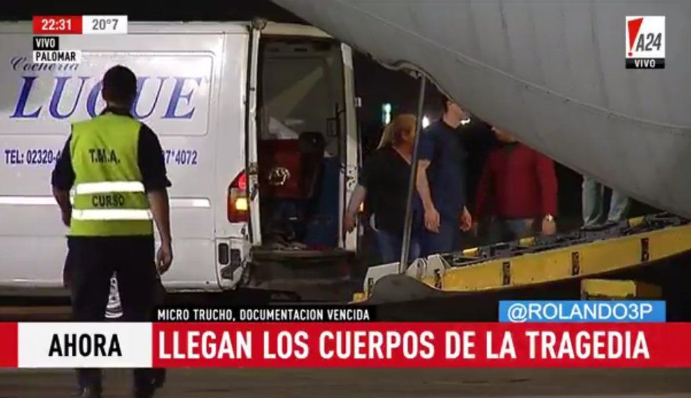 Pasadas las 22, el avión Hércules de la Fuerza Aérea aterrizó en la Base de El Palomar con los 15 féretros y familiares de los fallecidos. Este martes serán los velatorios.