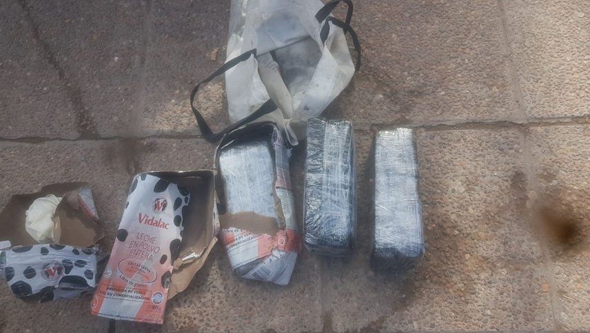 Cinco envoltorios tipo ladrillo y con cocaína, ocultos en cajas de leche fueron descubiertos por personal policial tras una persecución a dos sujetos de los cuales uno huyó y el otro fue aprehendido.