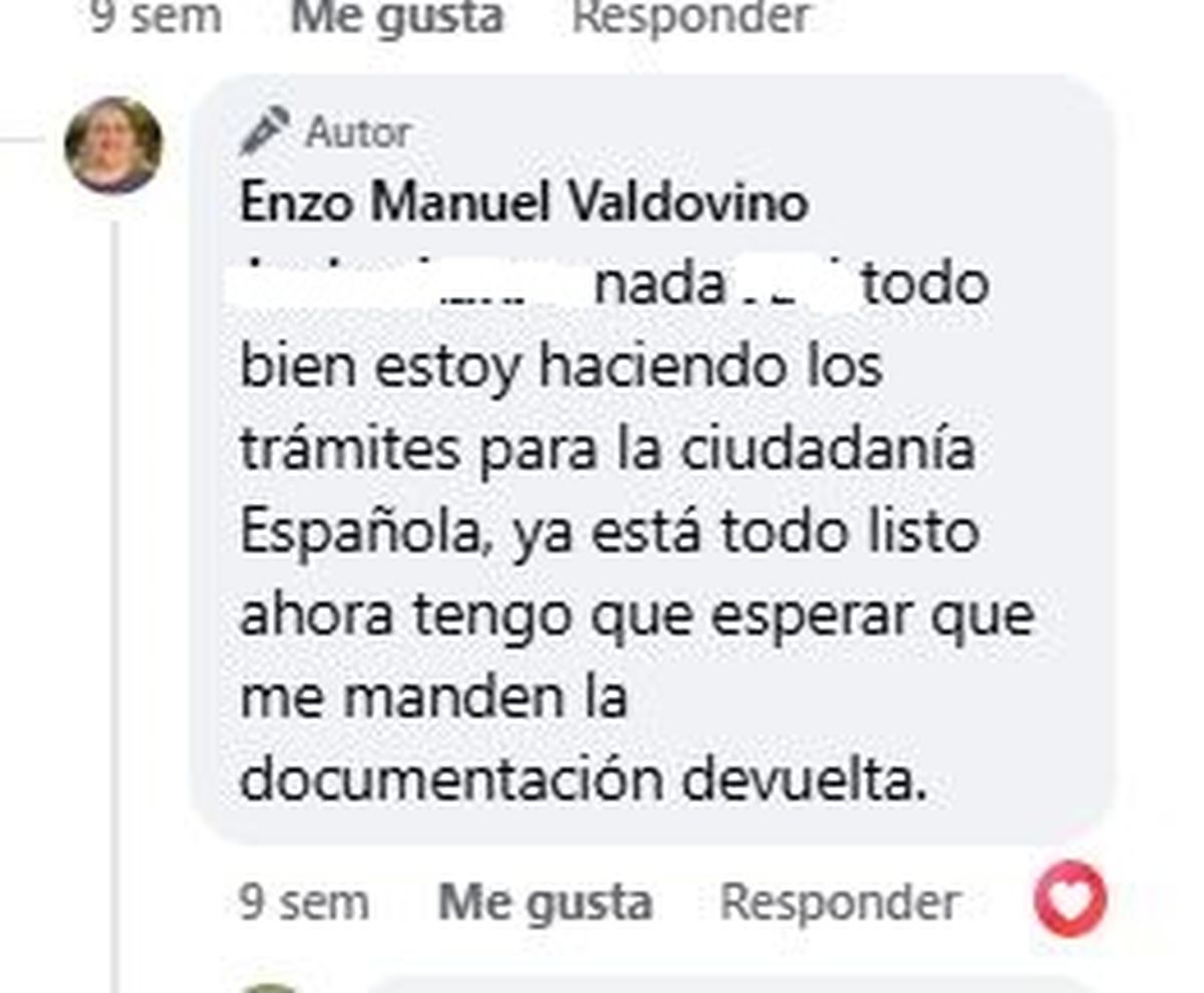 Según un posteo que data del 25 de junio, Valdovino estaba tramitando la ciudadanía española. En la publicación el hombre responde a algunos comentarios de sus contactos.