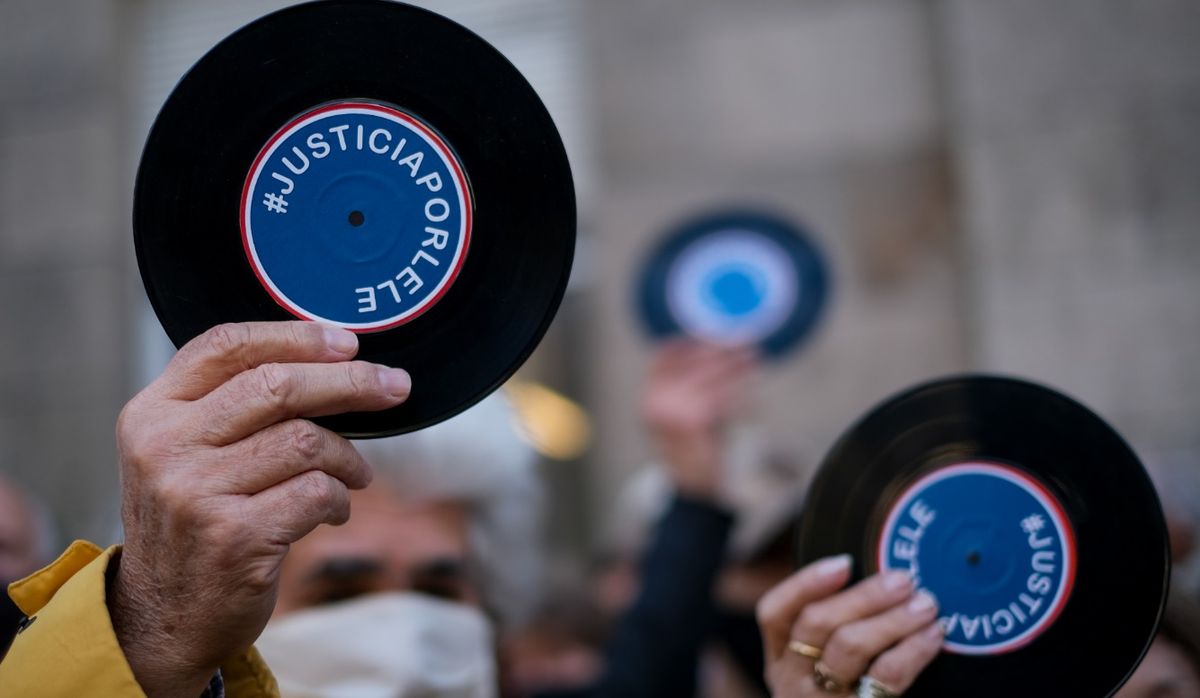En el acto estuvieron presentes Miguel y Mimí, padres de la víctima, y decenas de personas sostenían discos de vinilo con el reclamo "Justicia Por Lele".