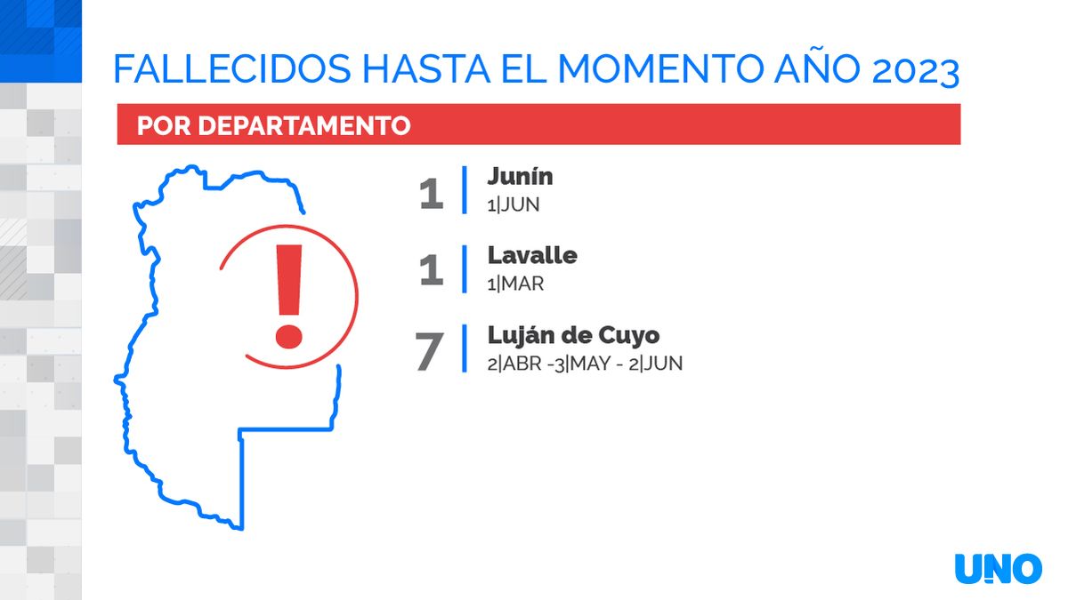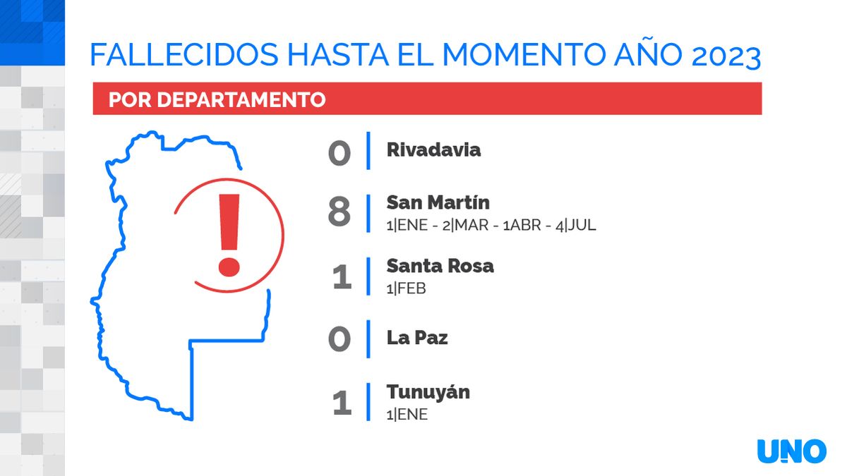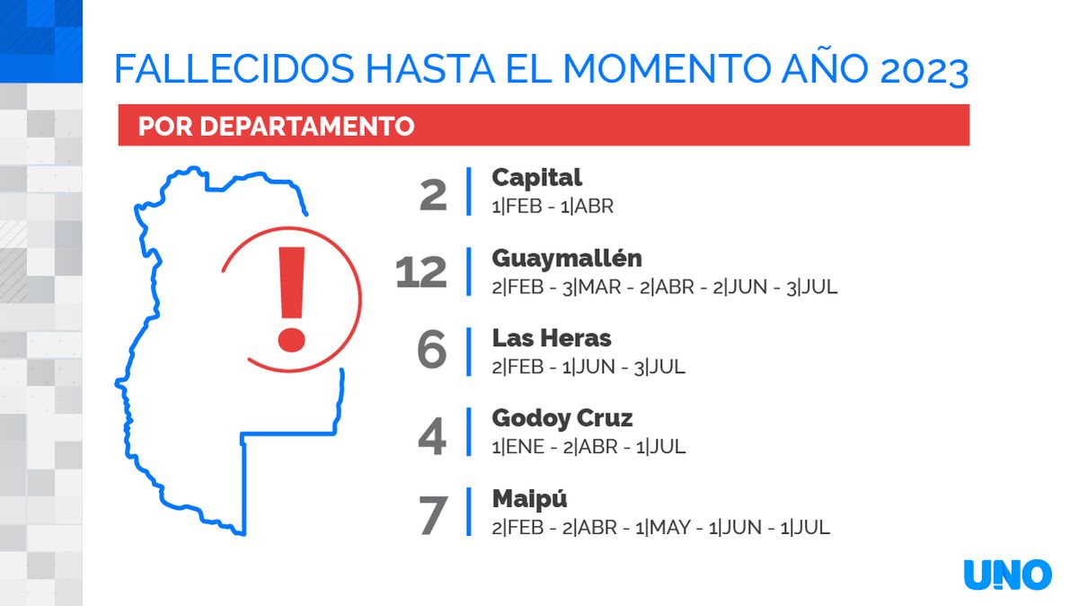 En el triste ranking de mortalidad en accidentes por departamentos, las comunas que lideran son Guaymallén y San Rafael, con 12 muertos entre enero y julio del 2023. Completa el podio San Martín, con 8.