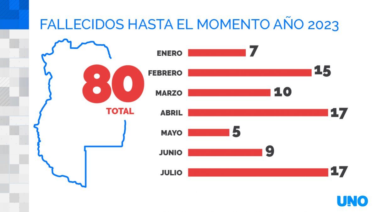 El comisario Javier López, jefe se Operativos Viales de la Policía de Mendoza, indicó que hasta ese momento, en julio de este año se habían producido 15 fallecidos en accidentes viales, pero unas horas después, la cifra se estiró a 17, con el motociclista muerto en la Costanera (15.30), y el camionero fallecido por la noche en El Salto, Luján (22.30), al saltar de su camión sin frenos. De esta forma se igualó al mes de abril, con 17 muertos en accidentes viales.