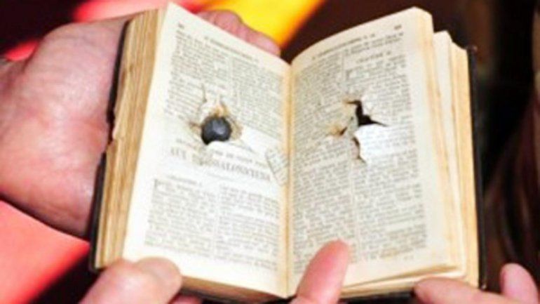 El policía resultó ileso porque la pequeña biblia que tenía en el bolsillo izquierdo de la camisa había amortiguado la bala, que dejó su rastro en el centro de las hojas.