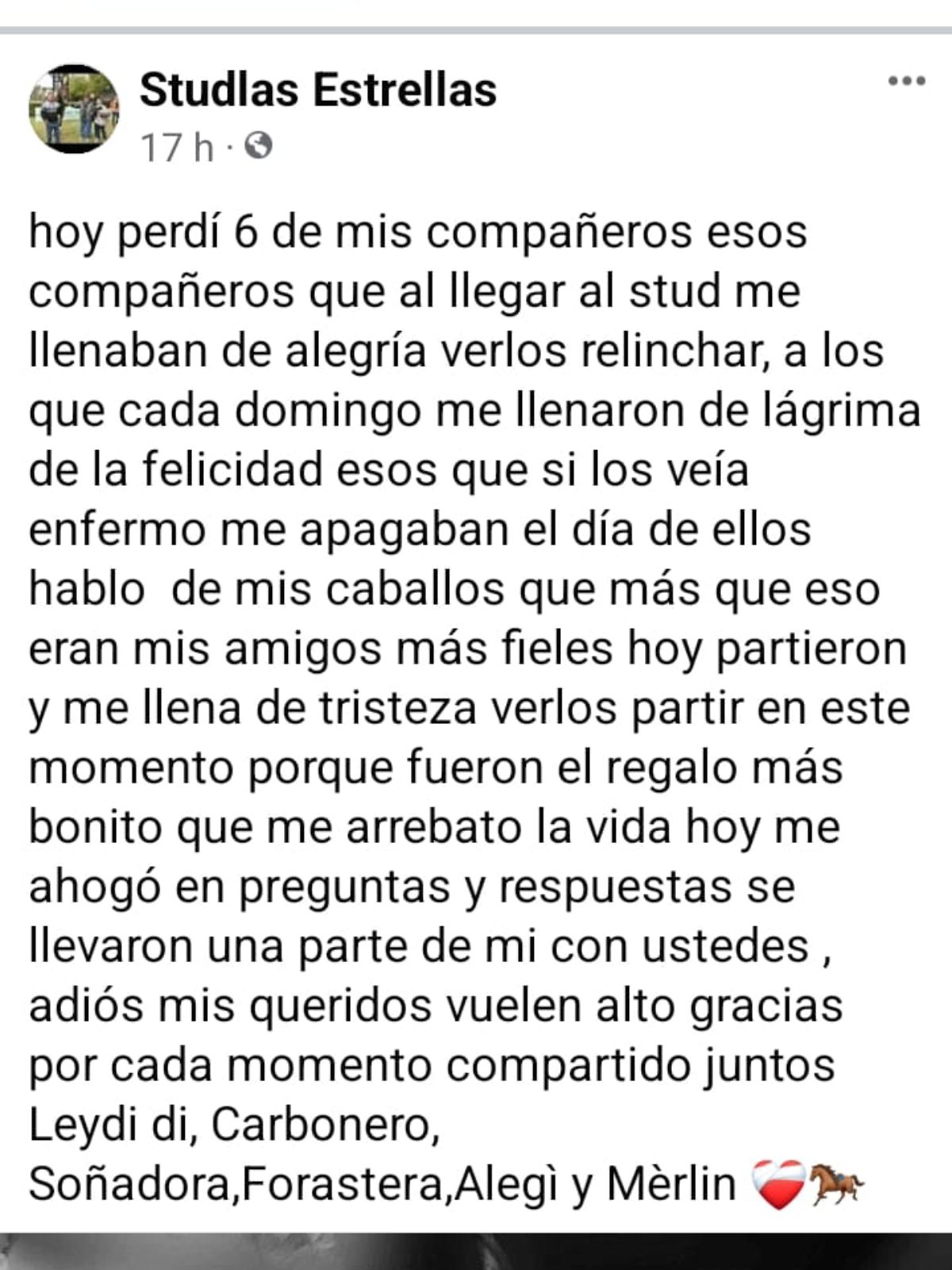 Personal de bomberos, luego de entrevistar a la propietaria de la finca, trabajó para extinguir las llamas en el establo donde había diez caballos de carreras. Allí estaba el stud Las Estrellas, que tiene como cuidador a Fabio Castillo, y que lamentó en sus redes sociales la lamentable pérdida de los equinos.