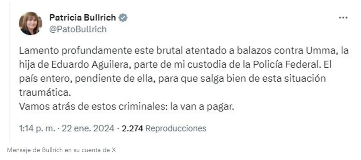 A través de su cuenta de X, la ministra de seguridad expresó: "Lamento profundamente este brutal atentado a balazos contra Umma, la hija de Eduardo Aguilera, parte de mi custodia de la Policía Federal. El país entero, pendiente de ella, para que salga bien de esta situación traumática".