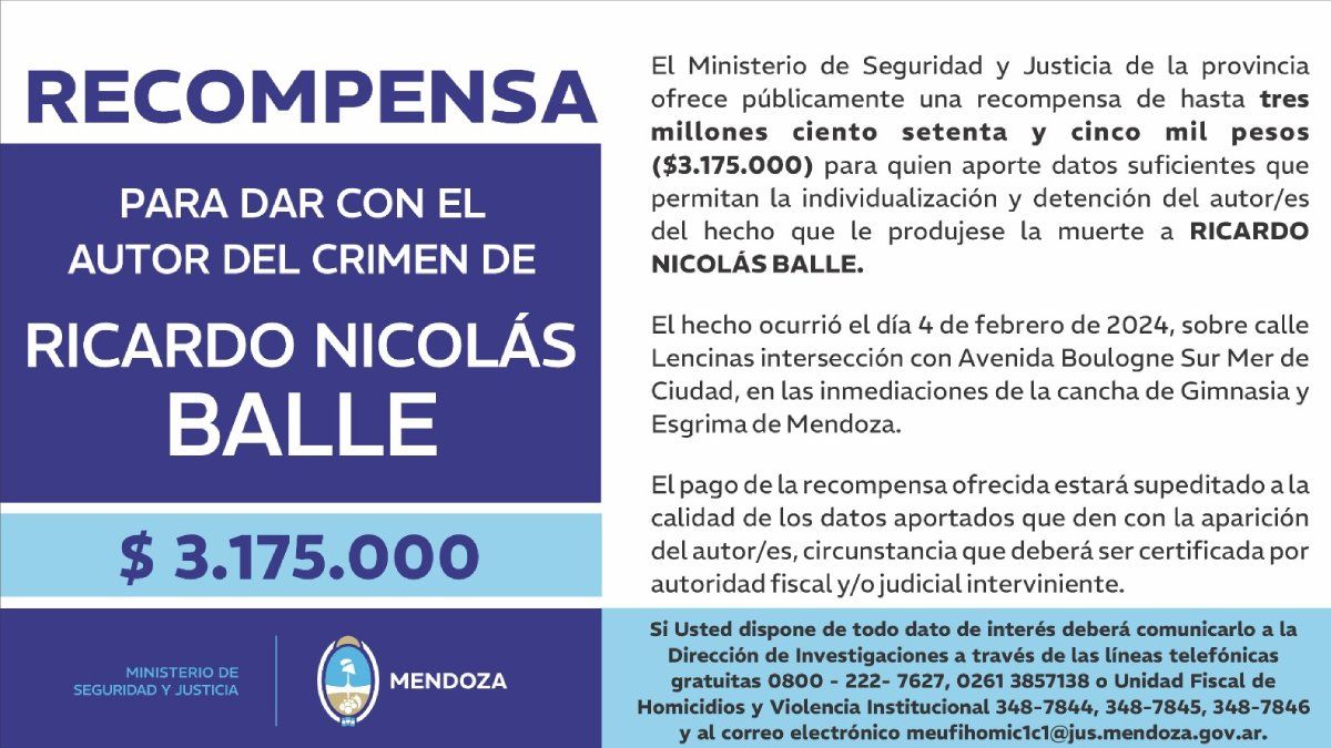 El Ministerio de Seguridad comunicó el pedido para quien aporte datos sobre el asesinato de Nicolás Balle (33), ocurrido en la puerta del Víctor Legrottaglie