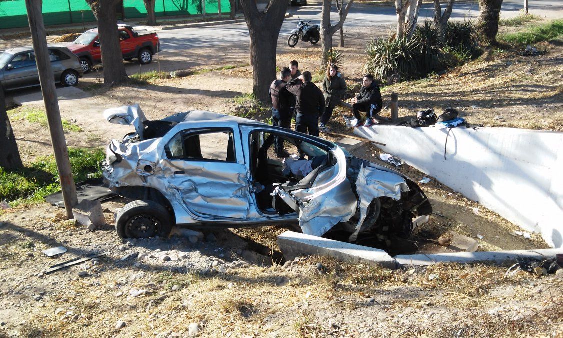 Un impresionante accidente ocurrió en la mañana de este domingo en el acceso este y el puente de hierro, en el ingreso a la ciudad de Mendoza.Tres jovenes iban a bordo de un peugeot 207 último modelo, cuando al tomar la curva en el acceso este en sentido hacia la ciudad, el vehículo derrapó, dio contra un árbol y quedó prácticamente destruido.