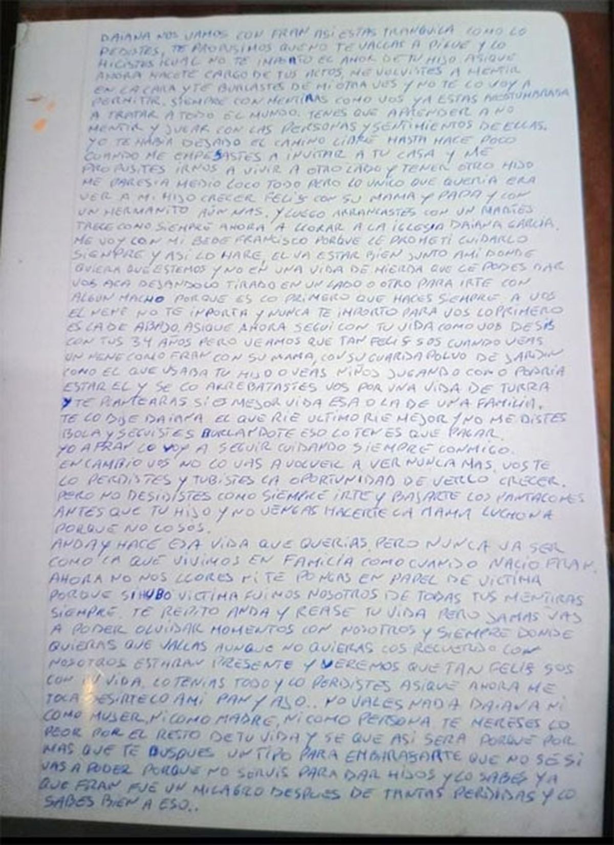 “Daiana, nos vamos con Fran así estás tranquila como lo decidiste, te propusimos que no te vayas a Pigüé y lo hiciste igual, no te importó el amor de tu hijo, así que ahora hacete cargo de tus actos”, continuó el escrito.