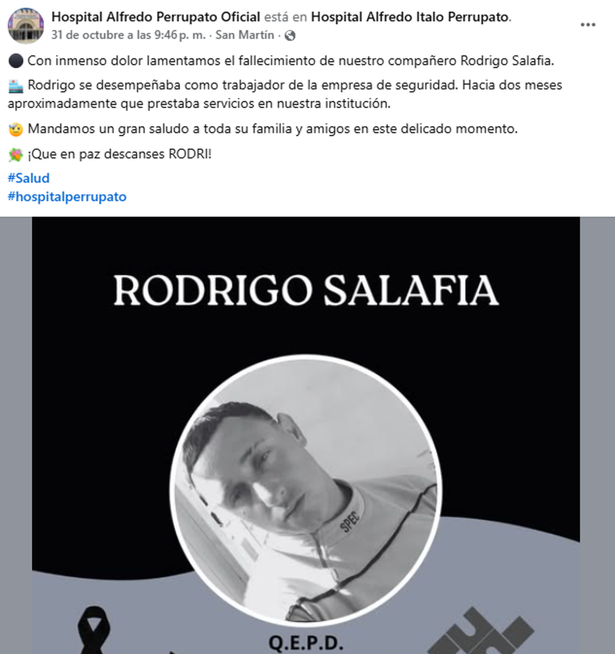 "Con inmenso dolor lamentamos el fallecimiento de nuestro compañero Rodrigo Salafia. Rodrigo se desempeñaba como trabajador de la empresa de seguridad. Hacía dos meses aproximadamente que prestaba servicios en nuestra institución", señaló el Hospital Perrupato.