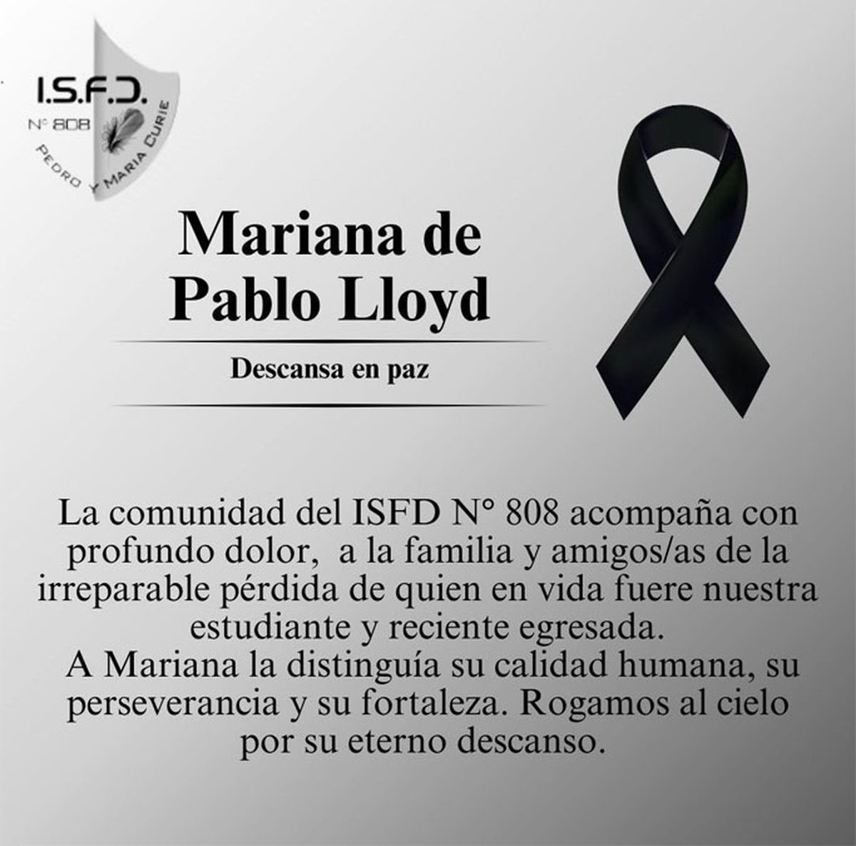 Mariana de Pablo Lloyd era madre de un niño pequeño y estudio y egresó en el Instituto Superior de Formación Docente (ISFD) N°808 “Pedro y María Curie”, establecimiento educativo de Chubut que expresó sus condolencias con los seres queridos.
