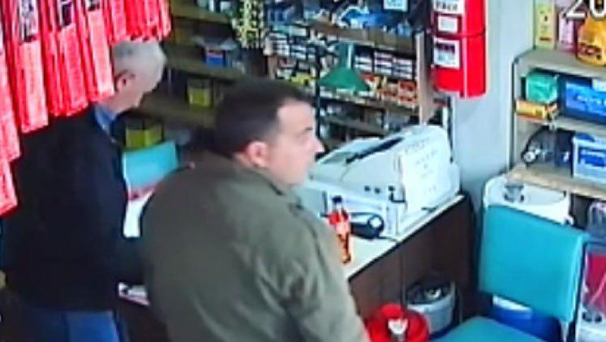 El dependiente va hacia atrás del comercio, posiblemente para buscar algo que le ha pedido el cliente, y éste aprovecha el momento para pasar atrás del mostrador, abril un cajón donde se guarda el dinero, mete la mano y retira el efectivo. Luego lo mete a uno de sus bolsillos y vuelve a cerrar el cajón.