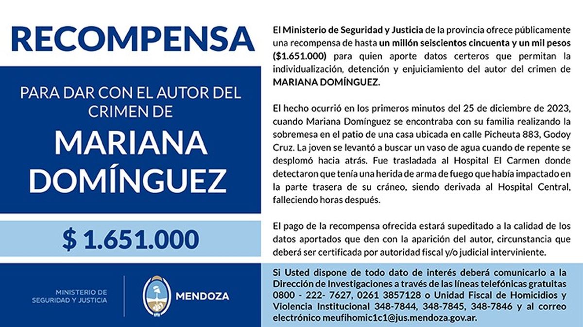 El Ministerio de Seguridad y Justicia publicó este jueves una recompensa de $1.651.000 para aquellas personas que puedan dar datos certeros que permitan dar con el autor del crimen de Mariana Domínguez en Godoy Cruz. La joven recibió un balazo en la cabeza en la celebración de Navidad, el pasado 25 de diciembre y falleció horas después.