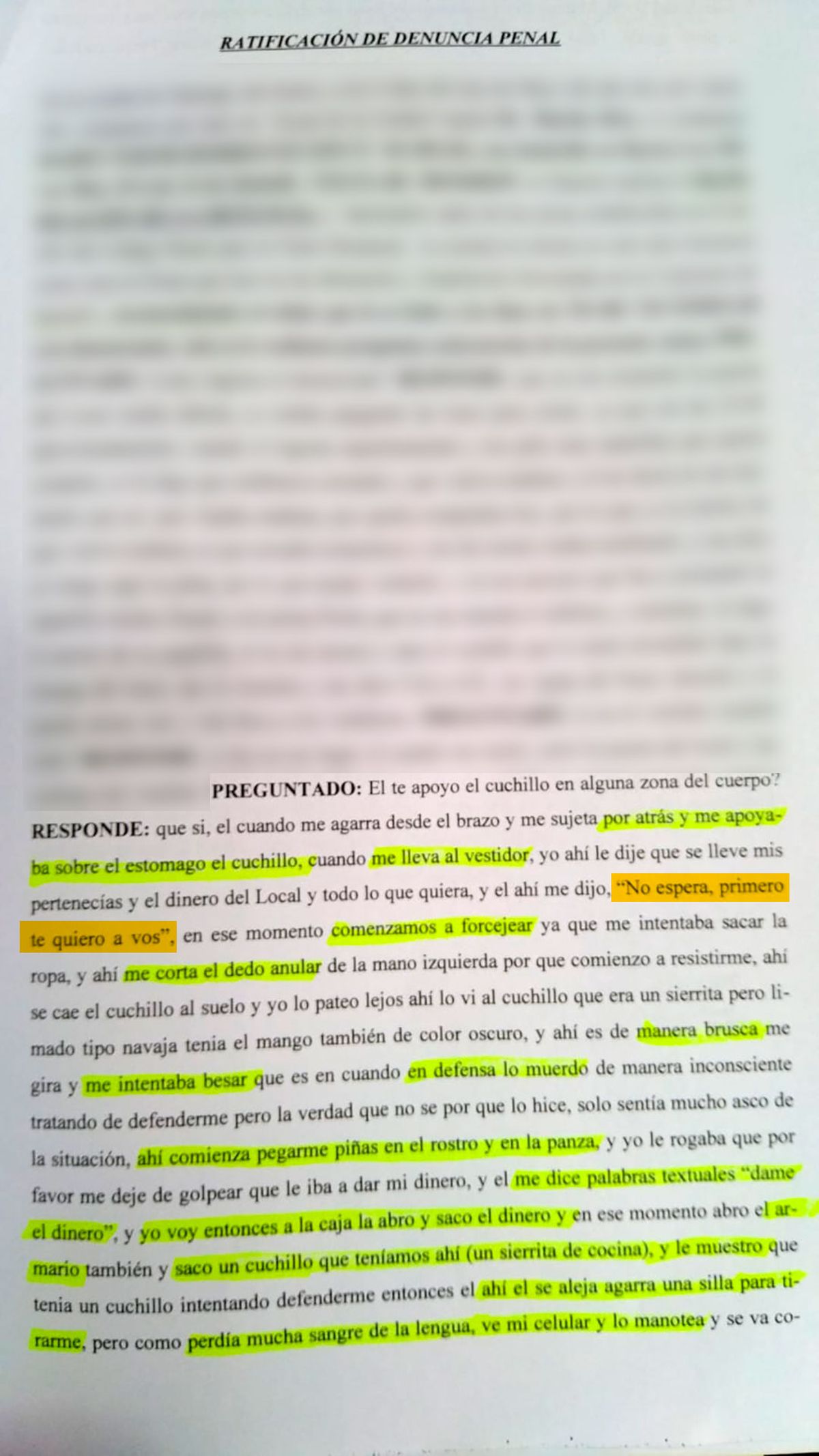 La chica relató "luego, intentó sacarme la ropa. Empezamos a forcejear y me cortó el dedo anular de la mano izquierda. Yo me resistí, el cuchillo se cayó al piso, y él quiso besarme de una manera brusca".