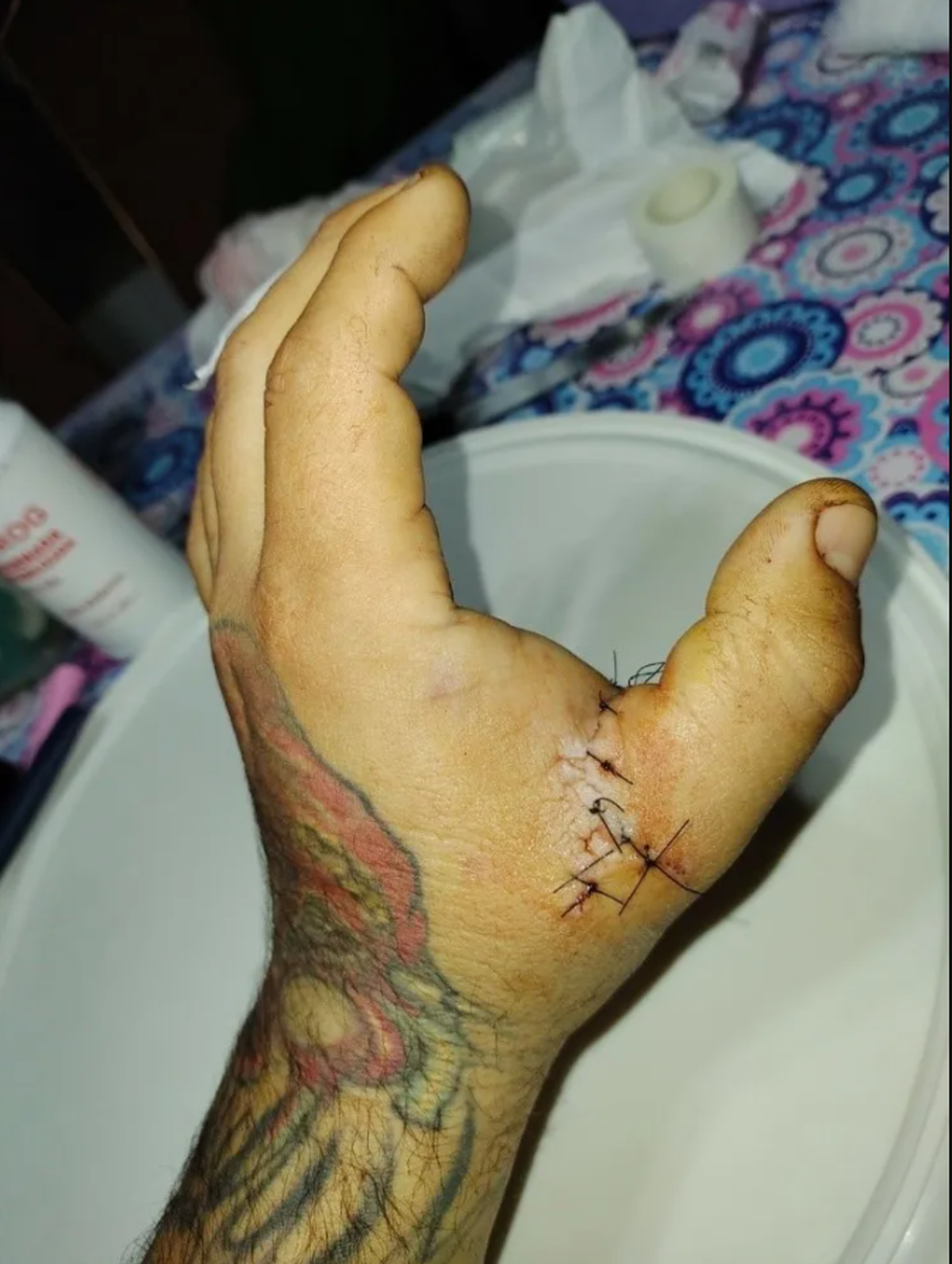 Tras generarse una discusión el hombre sacó un cuchillo Tramontina y la pelea terminó en el tatuador herido con un profundo corte entre el pulgar y el índice de su mano derecha, y el agresor también resultó lesionado.
