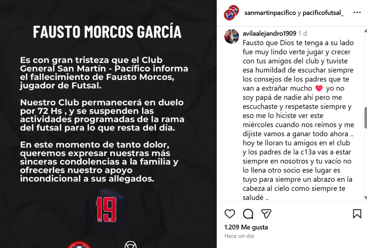 Tanto el CUC como el club San Martín-Pacífico le dedicaron a Fausto Morcos García un mensaje en las redes, en donde la emotividad estuvo a cargo de todos aquellos que comentaron los posteos.
