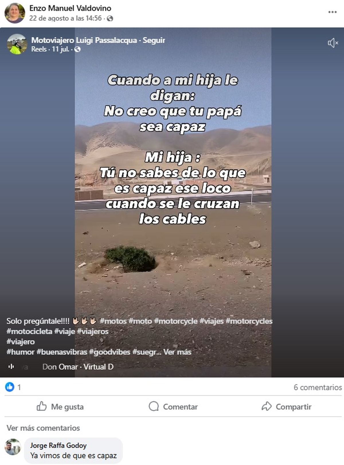 - "Cuando a mi hija le digan: no creo que mi papá sea capaz/ Mi hija: tú no sabes de lo que es capaz cuando se le cruzan los cables"