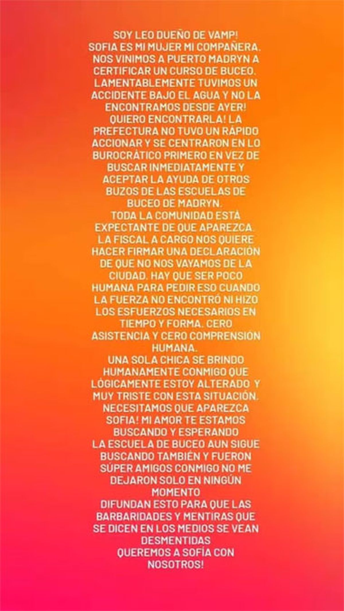 Mientras la búsqueda es incesante y se trabaja con buzos para poder encontrar a la joven desaparecida, Leo, novio de la chica de Buenos Aires, hizo un fuerte descargo sobre la tragedia y en otro, dedicado a Sofía Devries, su pareja.
