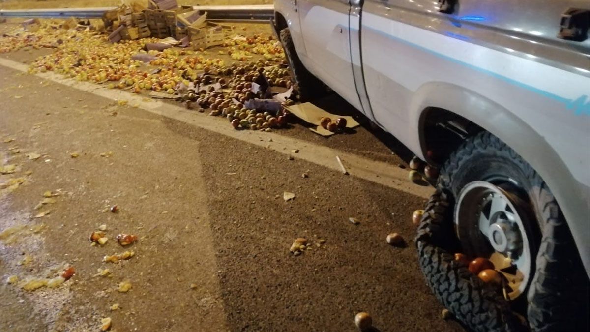 Como consecuencia el conductor perdió el control, giró sobre la calzada y chocó contra el guardarrail izquierdo. El vehículo quedó en sentido contrario y la carga desparramada por toda la ruta.